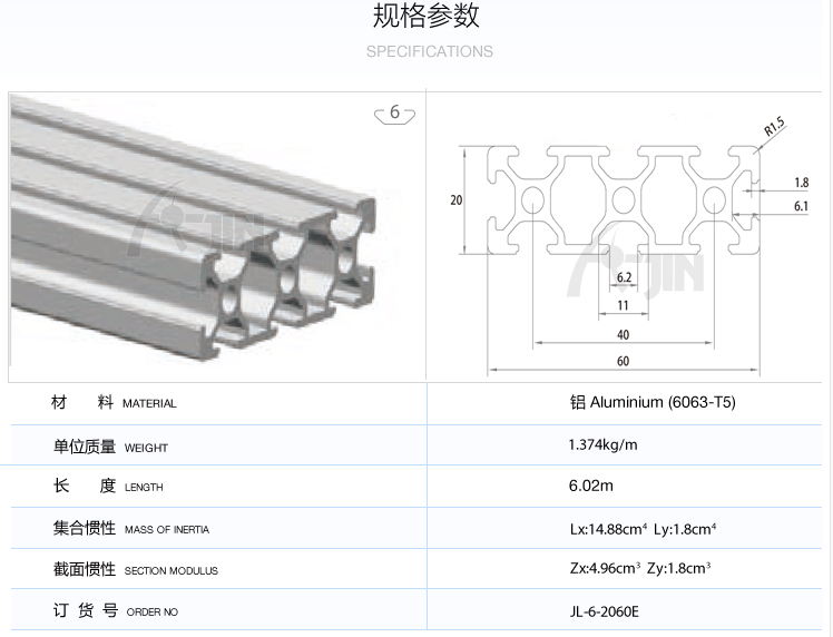 鋁型材2060E歐標的貨號:JL-6-2060E,有被稱作20*60歐標型材,是一款屬于槽6系列的鋁合金型材。它的材料:鋁合金Material Aluminum(6063-T5),單位質(zhì)量Weight:1.37kg/m,長度Length:6.01m,集合慣性 Mass of lnertia:lx:14.88 cm4 ly:1.8 cm4,截面慣性 Section modulus:Zx:4.96 cm3 Zy:1.8 cm3。