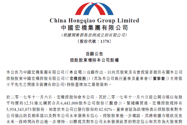中國(guó)宏橋近日發(fā)布公告稱(chēng),其控股股東宏橋控股知會(huì)公司,將于2017年11月6日從公開(kāi)市場(chǎng)以每股均勻價(jià)約12.51港元購(gòu)置合共644.3萬(wàn)股公司股份。緊隨購(gòu)置后,宏橋控股現(xiàn)持有約59.54億股股份,相當(dāng)于公司已發(fā)行股份約82.02%。記者從公開(kāi)材料查詢后發(fā)現(xiàn),宏橋控股為公司執(zhí)行董事及董事會(huì)主席張士平間接全資具有的公司。
