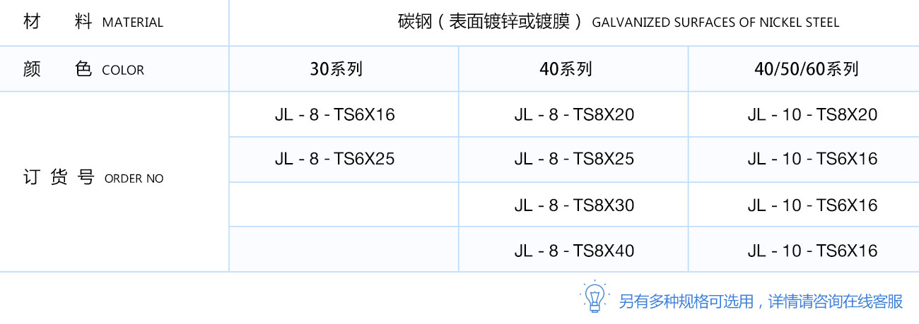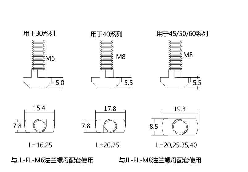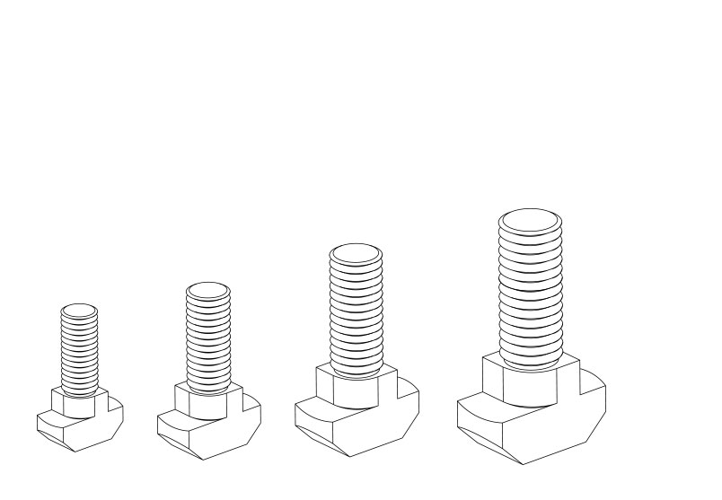 T型螺栓直接放入型材槽內(nèi),安裝過程中它能自動定位鎖緊,常與法蘭螺母配合使用,是安裝角件等型材配件的好幫手。根據(jù)不同型材,槽寬及按準過要求可選用不同規(guī)格及長度的T型螺栓。