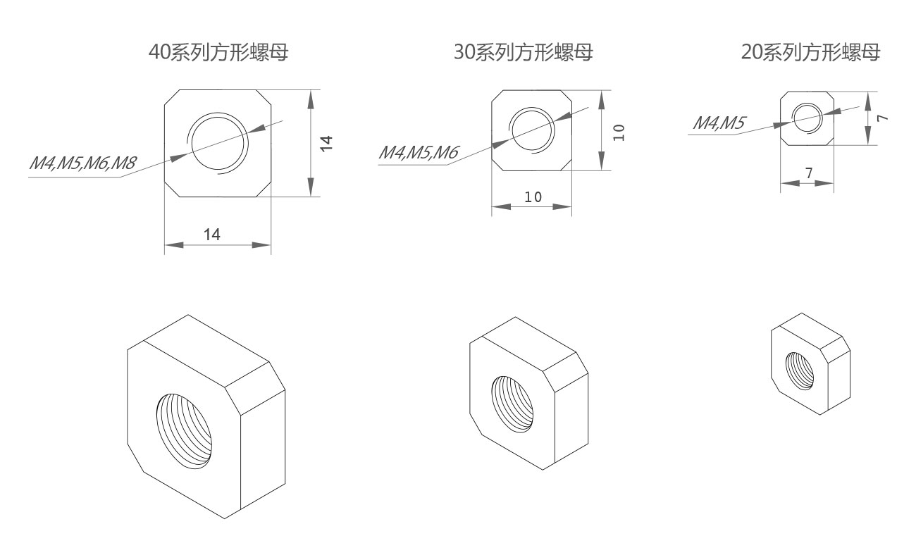 方形螺母是國際型材的專用螺母,用在國際型材上連接各種配件,安裝時需要預(yù)先放進(jìn)型材的槽坑內(nèi)。